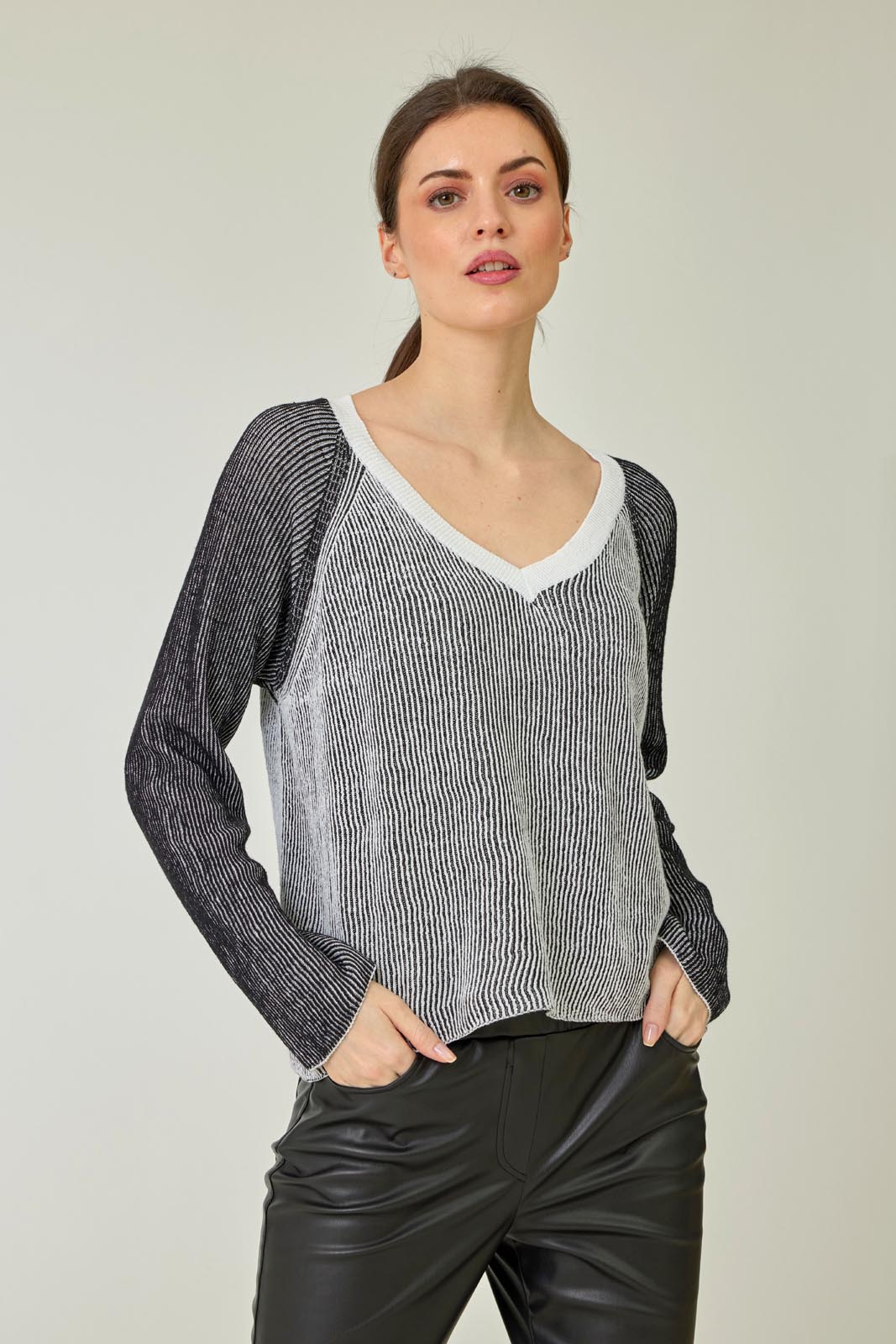 - Ärmel mit gedrehter Farboptik eingesetzt – sorgt für einen subtilen Farbwechsel